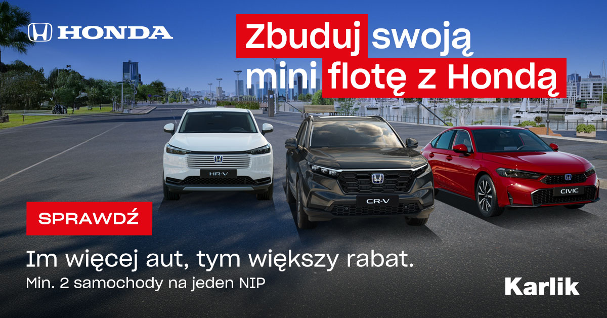 Prowadzisz firmę i planujesz rozwój swojej floty samochodowej? W Honda Karlik przygotowaliśmy unikalne rozwiązanie dla przedsiębiorców, którzy myślą perspektywicznie. Skorzystaj z dedykowanego programu „Mini Flota” i zyskaj warunki niedostępne dla klientów indywidualnych.